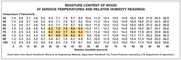 Wood in service usually is exposed to both long-term (seasonal) and short-term (daily) changes in the relative humidity and temperature of the surrounding air. Thus, wood virtually always is undergoing at least slight changes in moisture content. These changes usually are gradual, and short-term fluctuations tend to influence only the wood surface. Table 2 shows average wood EMC at various levels of relative humidity and temperature. It can be used as a basis for predicting the influence of the immediate environment on wood products, including wood flooring.