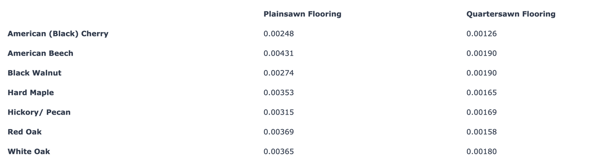 Table 1 lists the coefficients for dimensional change for the different hardwood species commonly used in flooring separated for plainsawn and quartersawn grain directions.